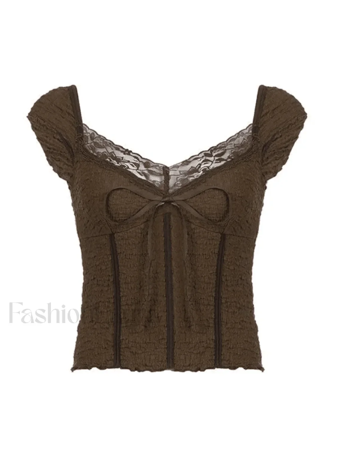 Description: Embrace retro vibes with this adorable lace-trimmed crinkle crop top. The cropped waist and short tank sleeves create a playful silhouette. Featuring a delicate lace trim along the collar and contrast paneled edges design. this top is a perfect blend of vintage and modern. Complete with a satin tie fastening on the front. it adds a charming touch to any outfit.