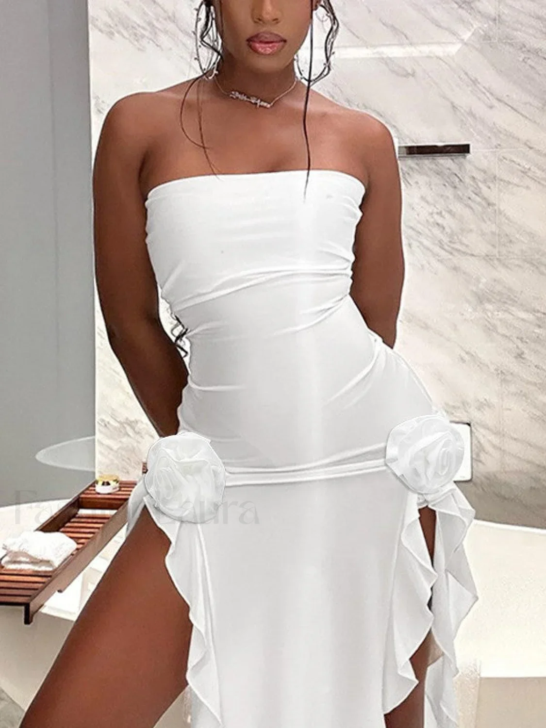 Description: It's made from stretchy mesh fabric. with dimensional floral embellished. features high leg split detailing. and has multi ruffle straps design.